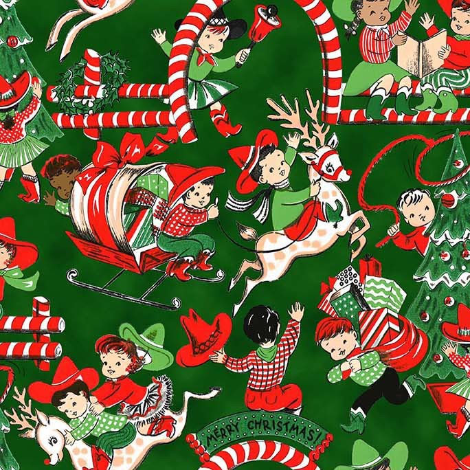 Round up the holiday with this retro style Christmas collection. This Michael Miller classic look showcases children riding reindeer trees filled with joy and presents galore. Giddyup in to the holiday season!