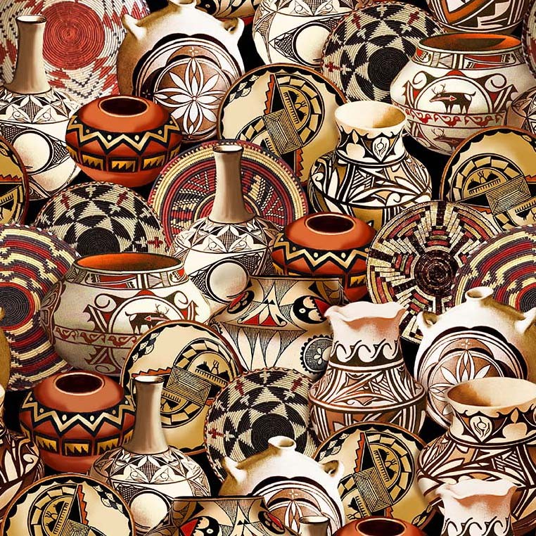 Travel with us to the Southwest. Collecting turquoise jewelry, dream catchers, and pottery. These vibrant prints make for a wonderful quilt design and truly pop against a black cotton couture background.