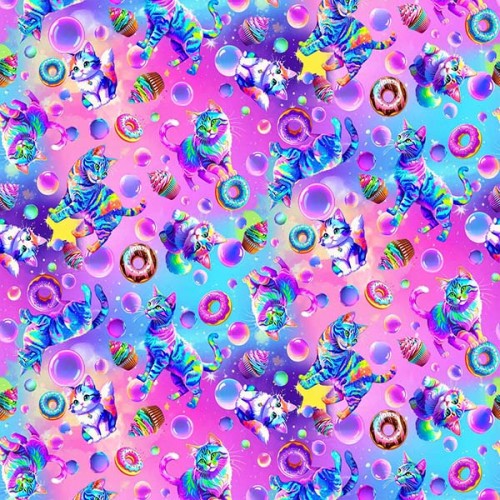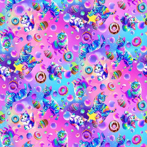 Machine wash cold with like colors. do not use chlorine bleach. tumble dry low setting. remove promptly. use warm iron if necessary.Neon Cats is a painterly celebration of rainbow-hued cats living in a glowing world of neon bubbles, dreamy donuts, and cupcakes. Each pattern bursts with rich textures and playful charm, capturing the wonder of childhood through the bright, curious eyes of these electric felines. It’s sugar-sweet, slightly mischievous, and totally unforgettable. Designed to make hearts smile, this collection invites quilters to stitch pure happiness into their projects—a cozy, glowing reminder that magic still lives in the small, silly things. “Happiness floats like a bubble... especially when a Neon Cat’s chasing it.” Perfect for those who love color, fun, and a dash of fearless imagination.