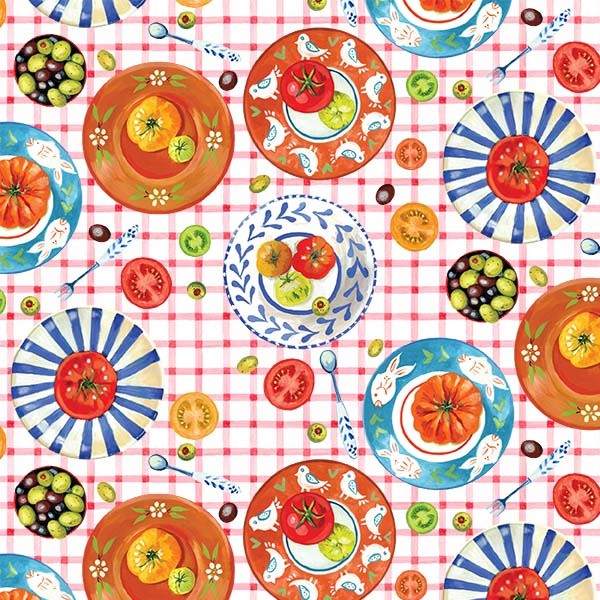 This fabric collection is a heartfelt homage to Nonna’s table — a warm, sunlit corner of Italy where tradition lives in every detail. Inspired by ripening tomatoes, hand-written recipes, and the comforting aroma of a simmering sauce, the palette bursts with rich reds, olive greens, sun-washed yellows, and terracotta hues. Bright and vibrant motifs echo hand-painted tiles and vintage ceramic plates, while intricate patterns recall Italian lace passed down through generations. Shuttered windows and herb pots on rustic sills add charm and authenticity, bringing everyday beauty into this collection. Each design tells a story of home, heritage, and the joy of slow, meaningful living — an invitation to wrap yourself in the soul of an Italian kitchen, where love is always the secret ingredient.