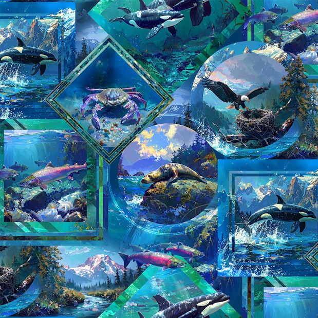 Wilderness in Motion is a love letter to the Puget Sound — a region where mountains meet the sea, and nature sings in wild harmony. This painterly collection captures the untamed rhythm of the Pacific Northwest: orcas slicing through deep blue waters, salmon leaping in silver arcs, and eagles soaring above misty forests. Cool rivers rush beneath snowy peaks while Dungeness crabs and seals bring flashes of color and life. Every brushstroke moves like music — sweeping, emotional, and full of motion, like Rachmaninov’s symphony painted on fabric. A breathtaking tribute to nature’s beauty and rhythm.